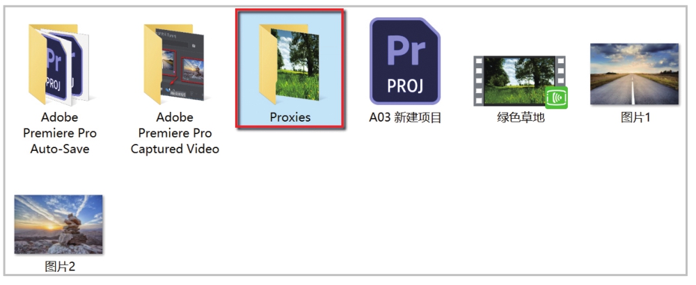 Premiere Pro会打开Adobe Media Encoder软件并渲染视频,渲染好视频后,打开项目文件夹会出现Proxies文件夹,如图A03-17所示。文件夹中就是新生成的代理文件。