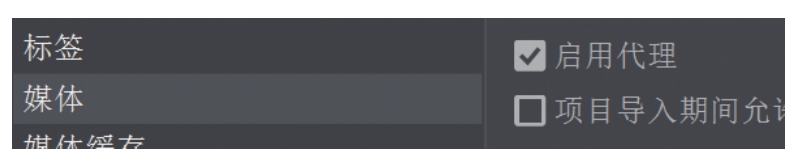 执行【编辑】-【首选项】-【媒体】命令,选中【启用代理】复选框,可以很方便地在源素材与代理文件之间快速切换,如图A03-18所示。