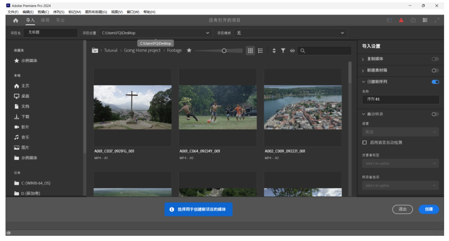 Premiere Pro 2024中将导入流程进行了重新设计,首先输入项目名称并选择存放项目的位置,然后单击窗口左侧本地文件的位置,可以看到窗口中的媒体资源,在这里可以预览、选择媒体,如图A03-2所示。