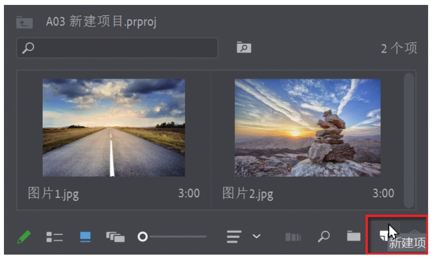 ◆ 也可以单击项目面板右下角的【新建项】按钮,在弹出的菜单中选择【序列】选项,如图A03-21所示。
