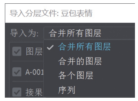 ● 【合并的图层】: 将素材中选中的图层合并为一个图层并导入,未选中部分被删除,默认情况下选中全部图层。