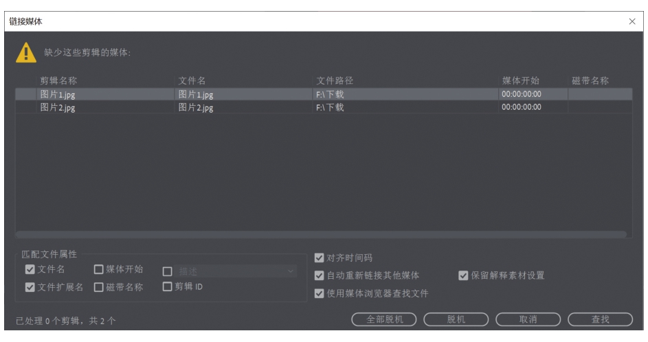 有时不小心误删或者移动素材文件后,打开项目会显示缺少媒体的弹窗提示,如图A03-19所示,【项目】面板中素材的图标会显示问号