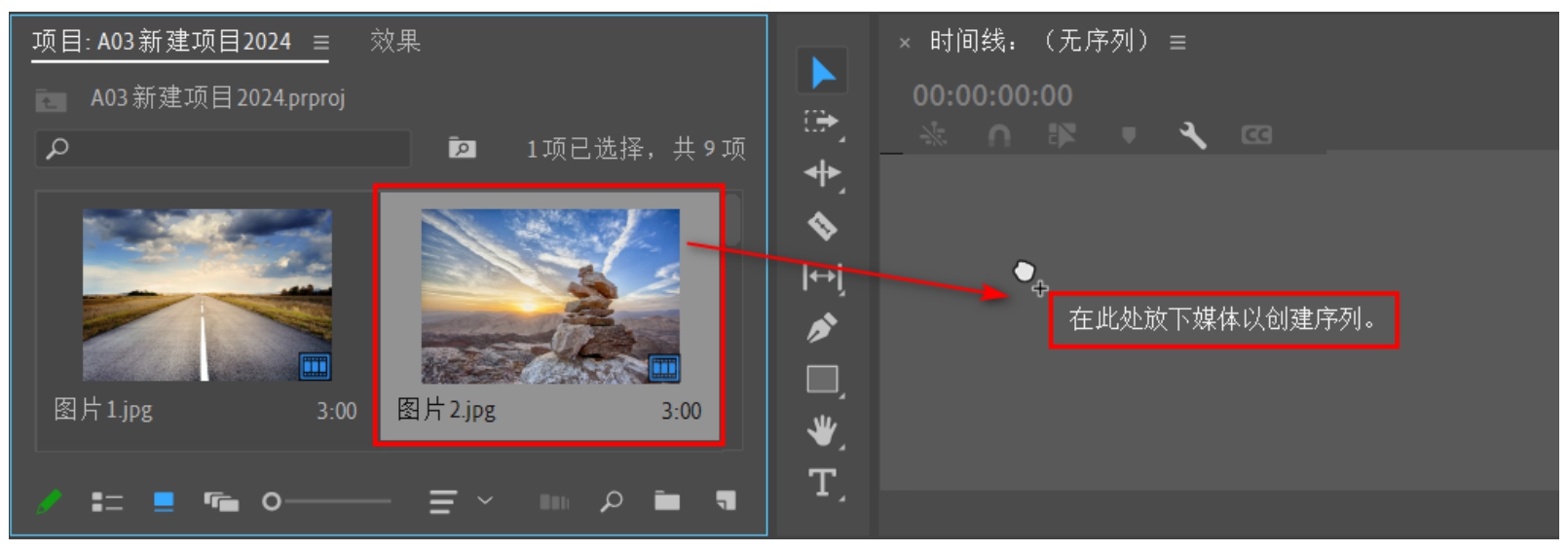 ◆ 直接拖曳图片至时间轴也可以快速创建序列,系统会提示“在此处放下媒体以创建序列”,如图A03-25所示。