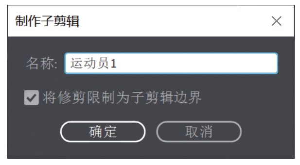 在【项目】面板中选择视频并粗剪视频,右击并选择【制作子剪辑】选项,在弹出的对话框中修改名称为“运动员1”,如图A03-14所示。选中【将修剪限制为子剪辑边界】复选框时,新生成的子剪辑会删除多余的部分,无法查看入点与出点之外的部分。