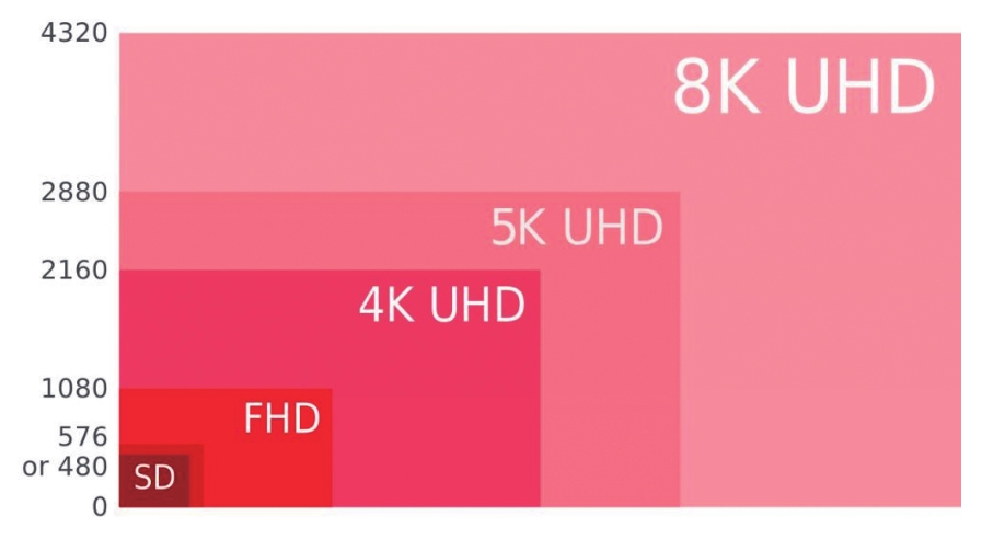 随着芯片的发展,影像技术不断提高,视频的尺寸(又称分辨率)也经历着重大变化,从SD(标清)到HD(高清),再到FHD(超高清)甚至4K UHD、8K UHD,画面的清晰度越来越高,如图A03-30所示。