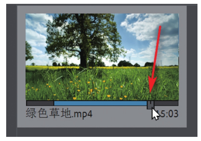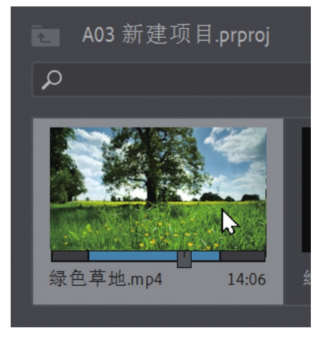 ◆ 在【项目】面板中粗剪:单击【项目】面板中的视频“绿色草地”,在图标中拖曳滑块并按I键、O键可以对视频进行粗剪,如图A03-13所示。不过这种方法比较粗略,需要在【源监视器】中进行调节。