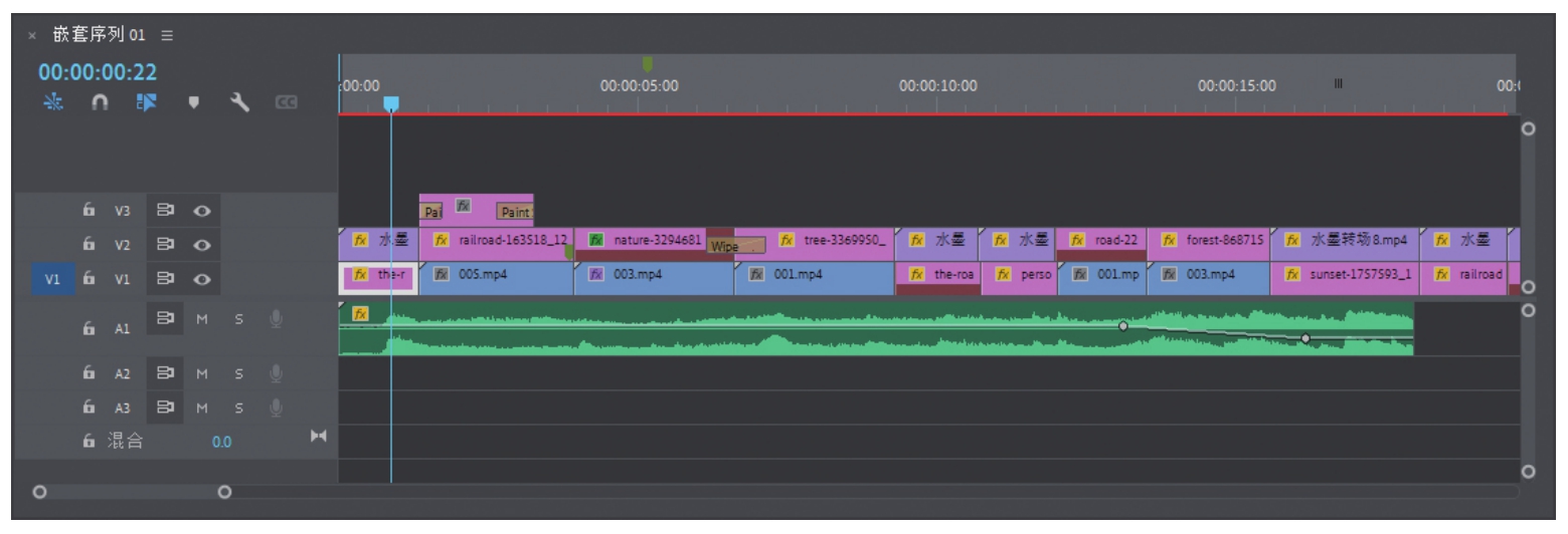 【时间轴】面板是主要的工作区域,是Premiere Pro界面中的重要面板之一,包括轨道层、时间标尺、时间指示器(指针)等。在【时间轴】面板中可以编辑和剪辑视频、音频文件,为文件添加字幕、效果等,如图A04-17所示。