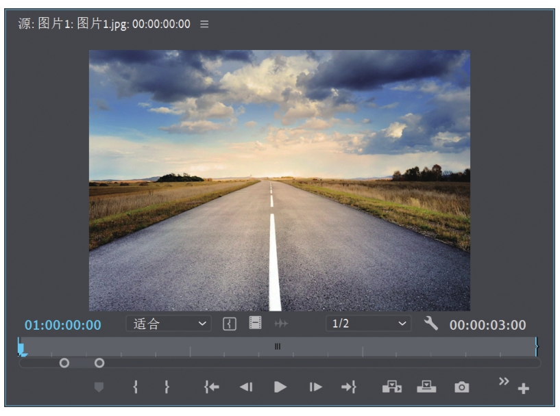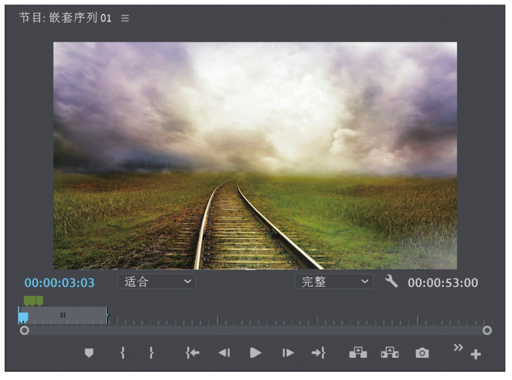 【节目监视器】面板与左侧【源监视器】面板相似,可对序列上的素材进行预览、编辑,显示序列中当前时间点的素材编辑后的效果,如图A04-15所示。