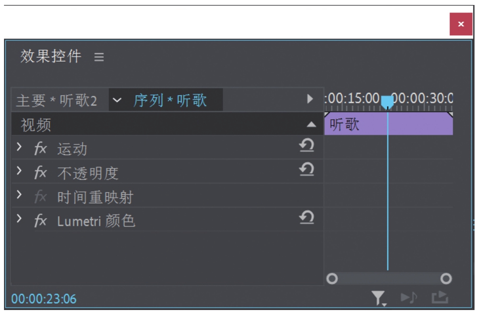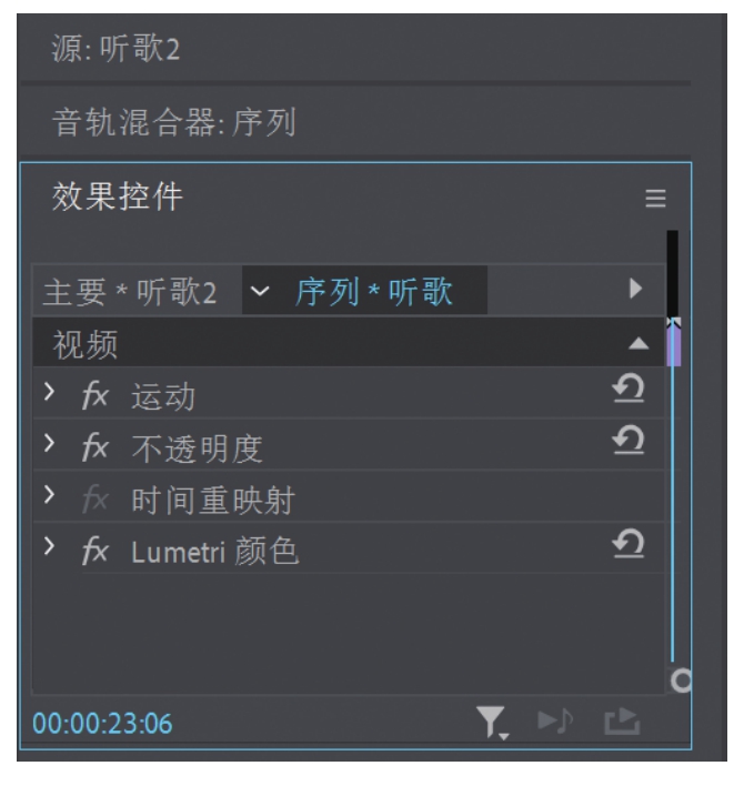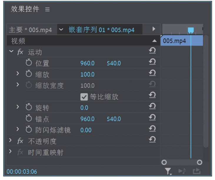 当把一个效果应用到剪辑之后,该效果的控制参数就会在【效果控件】面板中显示出来。在【时间轴】面板中选择一个视频剪辑,就可以对【运动】【不透明度】【时间重映射】等效果参数进行调整,如图A04-9所示。