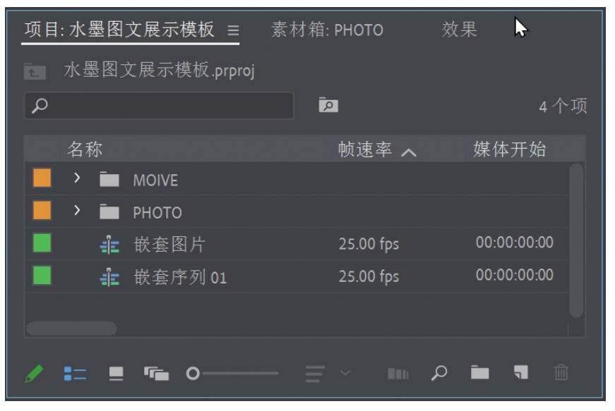 该面板的主要作用是管理素材文件,显示文件的名称、缩略图、长度、大小等基本信息,面板底部有【列表/图标显示方式】【查找选项】【新建素材箱】【新建项】【删除】等常规操作按钮,如图A04-5所示。