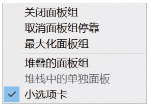 选择【面板组设置】选项还可以对多个面板一起操作,如图A04-20所示。选择【取消面板组停靠】选项可以将整个面板组变为浮动面板;选择【最大化面板组】选项可以将面板区域最大化显示,工作区中的其他面板就会消失;选择【堆叠的面板组】选项可以将面板组中的面板变为选项卡的形式,如图A04-21所示。