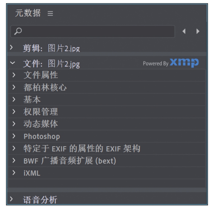 【元数据】面板可以更为详细地展示素材的原始数据,除了展示入点、出点,还会直接展示拍摄日期、拍摄设备、是否脱机等,方便随时调用和查看,如图A04-14所示。
