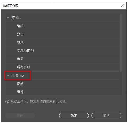 如果工作区的面板出现混乱,选择【重置为已保存的布局】选项就可以恢复当初保存的布局。还可以选择【编辑工作区】选项,在弹出的对话框中拖动各个工作区,使工作区显示在栏中、在溢出菜单中或者不显示,如图A04-4所示。