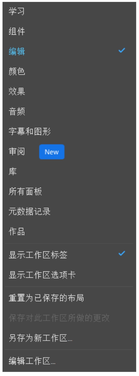 工作区包含一系列预先排列好的面板,如图A04-2所示。不同工作区执行不同的工作命令,例如,编辑工作区适合做编辑任务,音频工作区适合处理音频,颜色工作区适合调整颜色等。直接单击右上角的工作区切换按钮