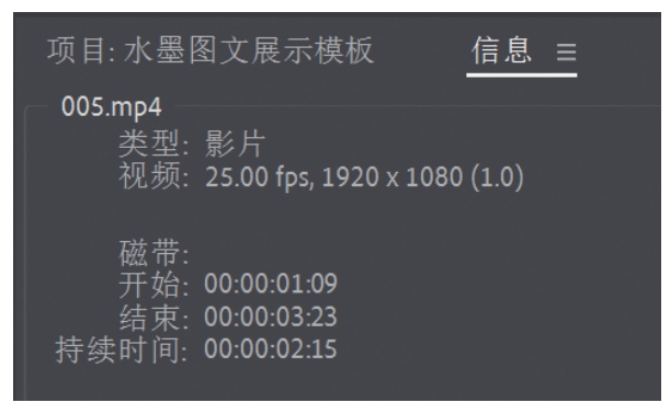 在项目中选择一个素材,或者从序列中选择一个剪辑或过渡时,相关信息就会在【信息】面板中显示出来,如图A04-7所示。