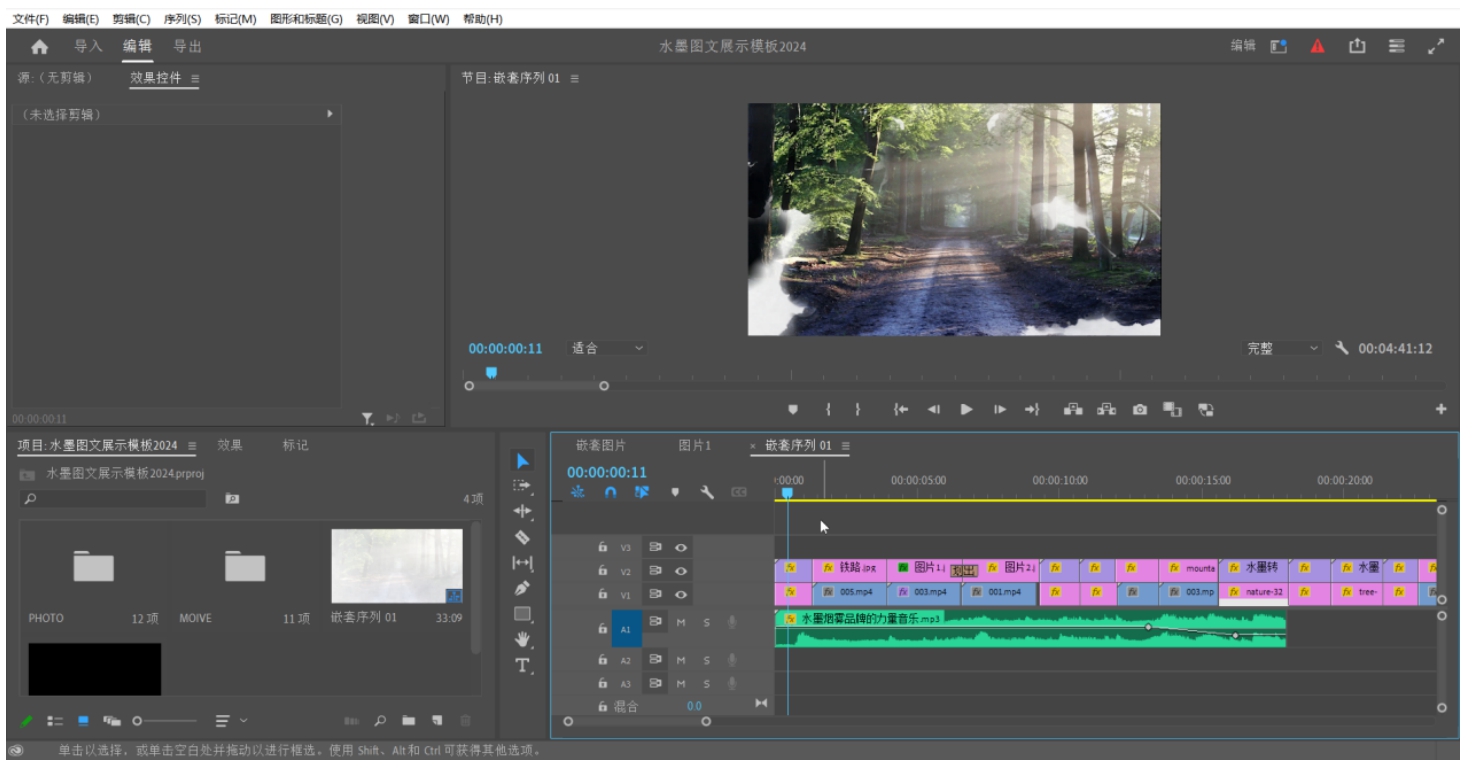 本课来了解Premiere Pro的用户界面。打开本课提供的“水墨图文展示模板”项目文件,如图A04-1所示。