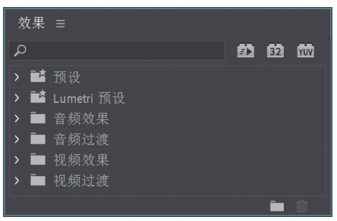【效果】面板中包含可以应用到剪辑上的效果,包括视频效果、音频效果、过渡等。这些效果都是按类型分组的,方便查找。在面板顶部有一个搜索框,通过输入关键字即可快速查找到所需要的效果,如图A04-8所示。效果一旦应用,其控制参数就会在【效果控件】面板中显示出来。