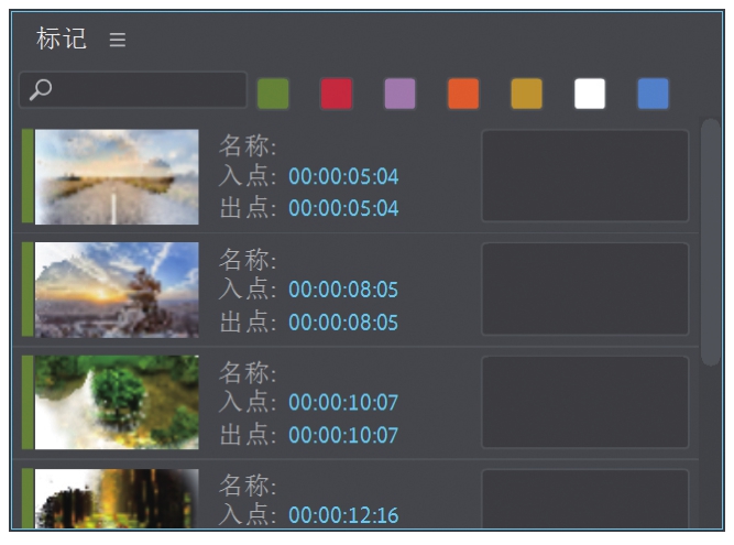 【标记】面板给素材文件添加标记,可以快速定位到标记的位置,为操作者提供方便。若素材中标记点过多则容易出现混乱,可以给标记赋予不同的颜色,如图A04-10所示。
