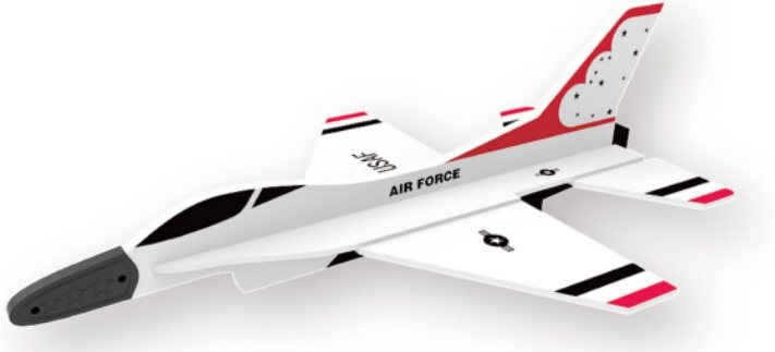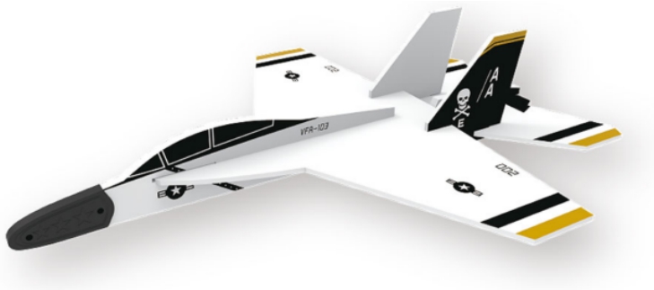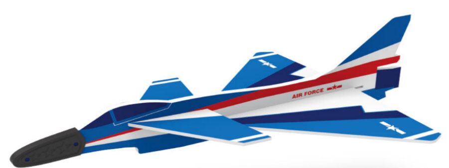 F-16战斗机和F-18战斗机也有对应的手掷飞机模型,如图2.2.11和图2.2.12所示,其中,F-16战斗机模型的翼展为215mm,机长为305mm,F-18战斗机模型的翼展为250mm,机长为305mm。从以上模型中任选一种进行设计、制作和放飞,也可以进行改进飞行,探究各个可调整舵面对飞机模型飞行的影响,实现各种特技飞行,并尝试进行直线距离竞赛飞行,尝试如何才能将模型飞得更远。