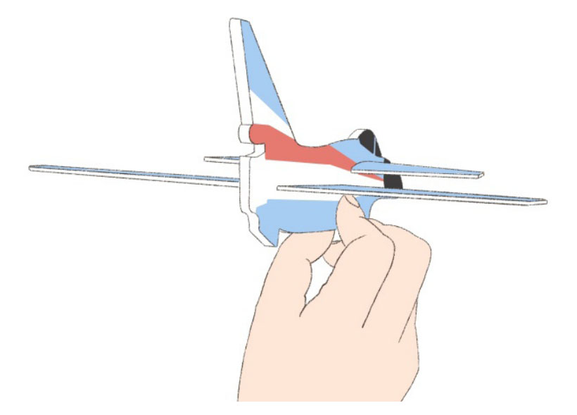 手放置于机翼下方模型重心的位置,将模型水平掷出,如图2.2.7所示,观察模型飞行的航向,手掷时把握好手掷的力量,保证模型能够平滑飞行。若模型左偏或右偏,调整模型的方向舵,直至模型能够直线飞行。