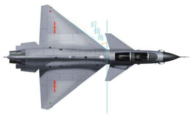 仔细观察歼10战斗机的主机翼可以发现,主机翼采用明显的前缘后掠设计,一侧的机翼近似成大三角形,如图2.2.2所示。后掠机翼是指前缘和后缘均向后掠的机翼,机翼后掠程度可用后掠角表示,即机翼前缘与垂直机身方向的夹角,如图2.2.3所示。后掠机翼是跨声速和超声速飞机普遍采用的机翼形式,后掠机翼的气动特点是可以提高机翼的临界马赫数,推迟激波的到来,并减小超声速飞行时的阻力。后掠机翼在高速时具有优良性能,但失去了原来无后掠机翼的良好低速飞行的性能。