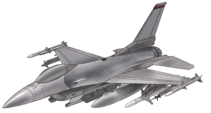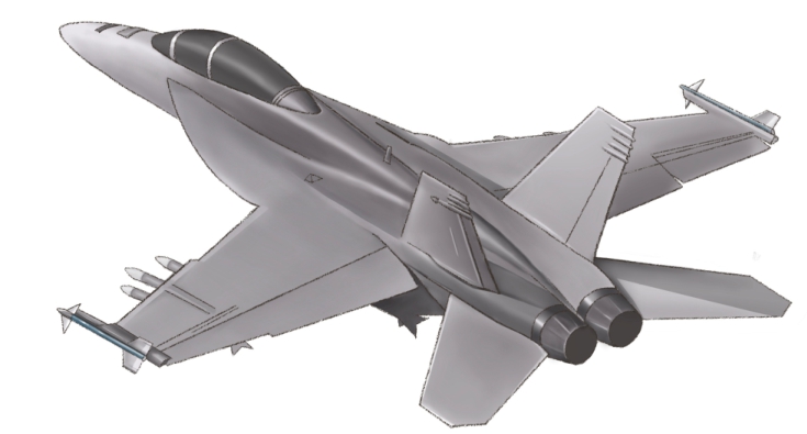 歼10战斗机采用的是水平尾翼前置的鸭翼布局,而F-16战斗机和F-18战斗机采用的是水平尾翼后置,如图2.2.9和图2.2.10所示,其中F-18战斗攻击机采用双垂直尾翼气动布局,并安装两台涡扇发动机,是一型多用途战斗机。