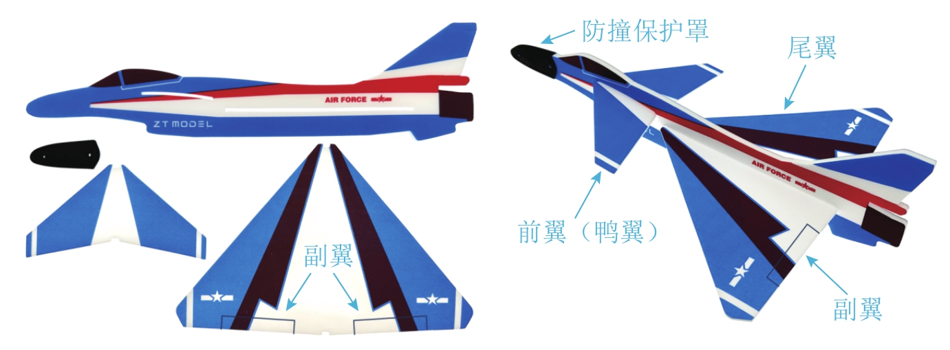 前翼和主机翼分别插入机身对应的卡槽内,并安装到位,有图案的一面朝上,安装过程中不可用力过大,保证翼面的平整,避免机翼和机身发生变形或断裂。然后把机头保护罩安装到模型的头部,起到加强和保护作用,如图2.2.5所示。