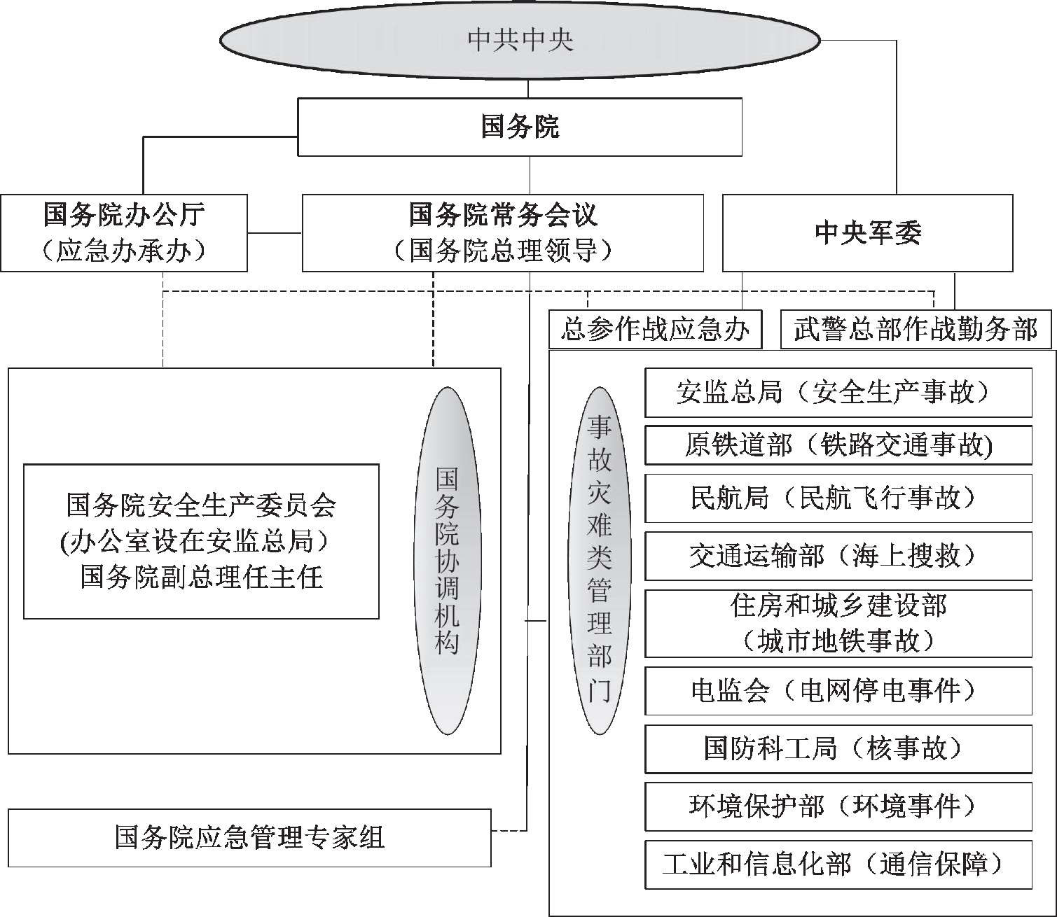 根据突发事件应对法和国家总体应急预案,我国建立统一领导、综合协调、分类管理、分级负责、属地管理为主的应急管理体制。在中央层面,已经基本上形成了一个依托于国务院办公厅应急办发挥枢纽作用、以若干议事协调机构和联席会议制度为协调机制的综合协调型应急管理体制。国务院办公厅已经于2006 年 4 月设置国务院应急管理办公室(国务院总值班室),承担国务院应急管理的日常工作和国务院总值班工作,履行值守应急、信息汇总和综合协调职能,发挥运转枢纽作用。国务院是突发事件应急管理工作的最高行政领导机关,在总理领导下,通过国务院常务会议研究、决定和部署特别重大突发事件应急管理工作;国务院副总理、国务委员按照业务分工和在国家相关突发事件应急指挥机构中兼任的职务,负责相关类别突发公共事件应急管理工作;国务院副秘书长协助国务院领导同志处理有关工作。