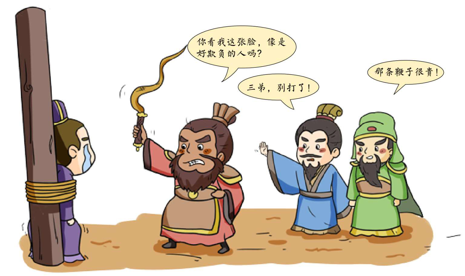 督邮的下属想拦下张飞,可他们怎么能拦得住世上少见的猛将?张飞闯进督邮的房间,把他揪到大街上,捆在柱子上,当着众人的面用鞭子抽。张飞打得正痛快呢,刘备闻讯赶来,拦住了他,说:“别打了,别打了。”