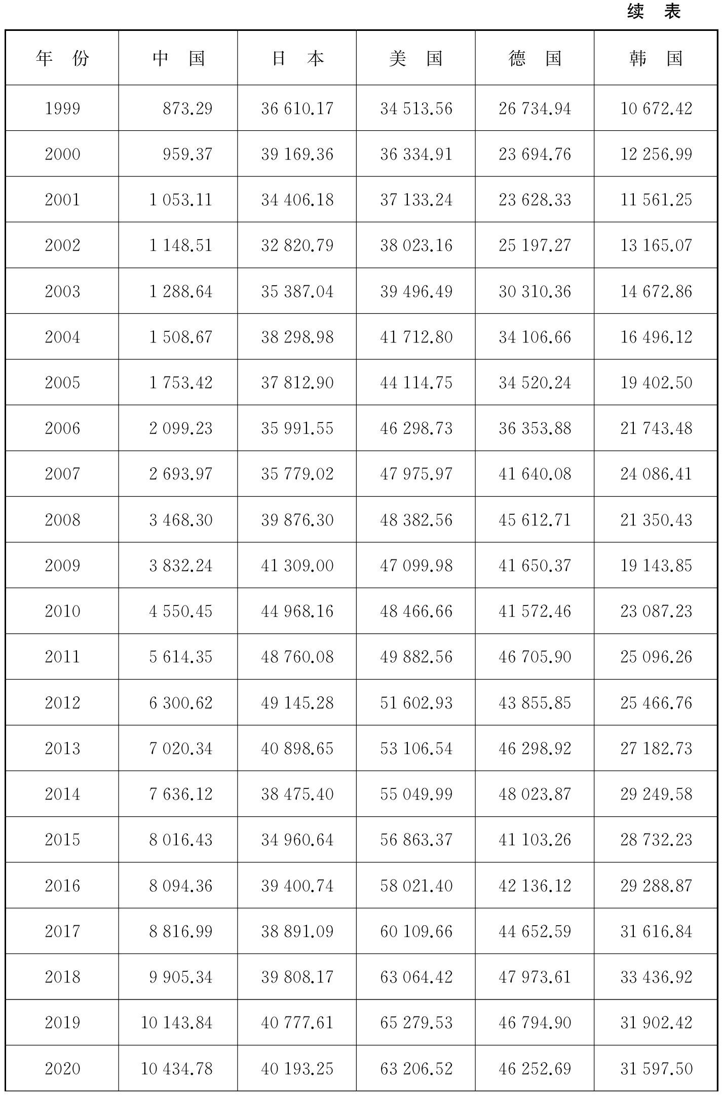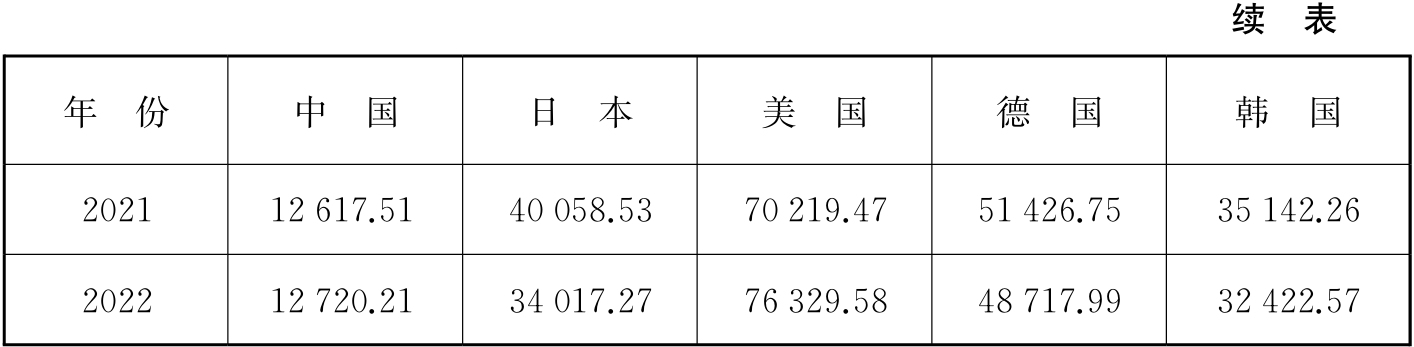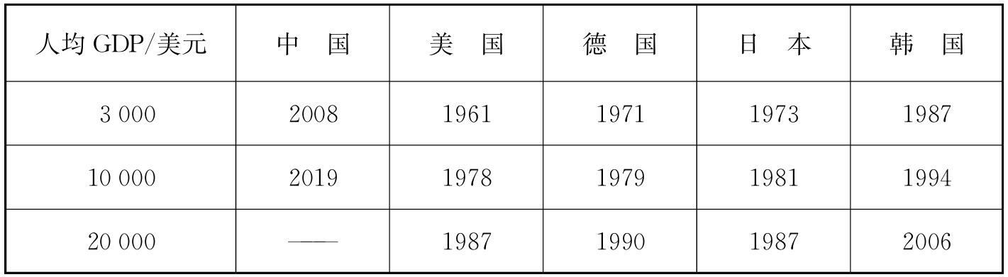 以人均GDP 3 000美元、10 000美元、20 000美元为三大关键点,我国与日、美、德、韩四国首次突破关键点的时间如表2-3所示。我国人均GDP于2019年首次突破10 000美元大关,日本、美国、德国、韩国人均GDP突破10 000美元的年份分别为1981年、1978年、1979年、1994年。