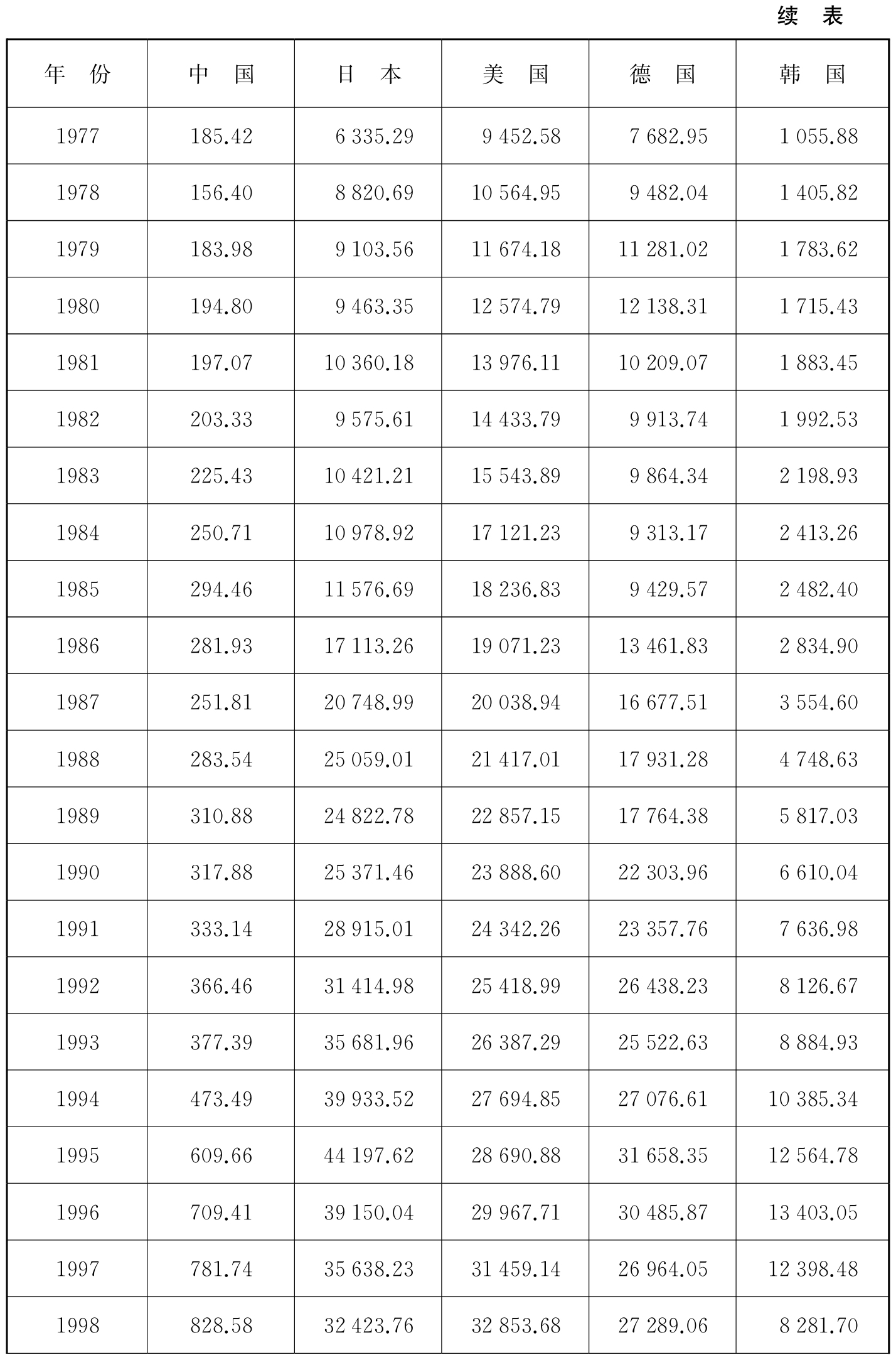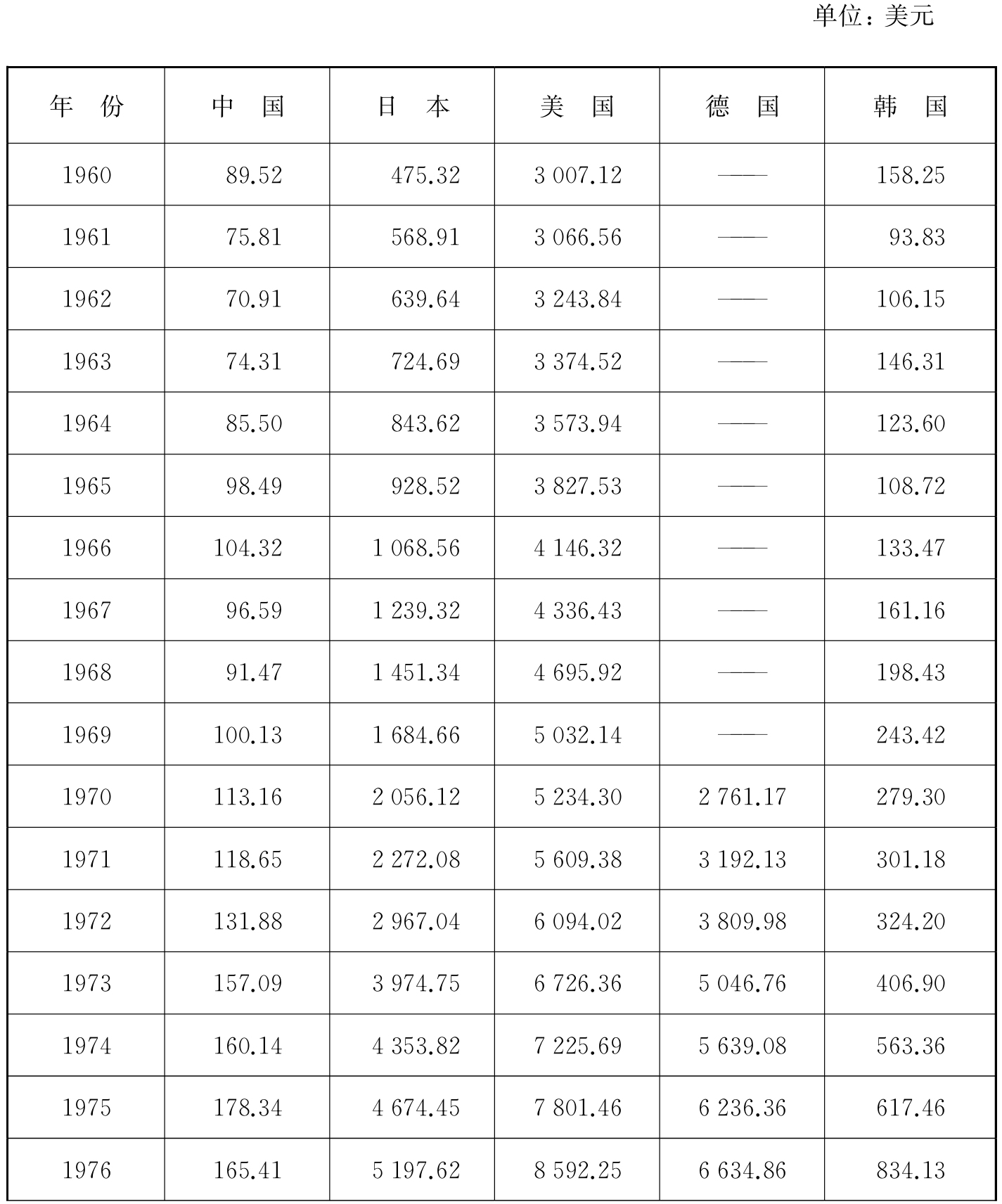 表2-1 1960—2022年中、日、美、德、韩人均GDP