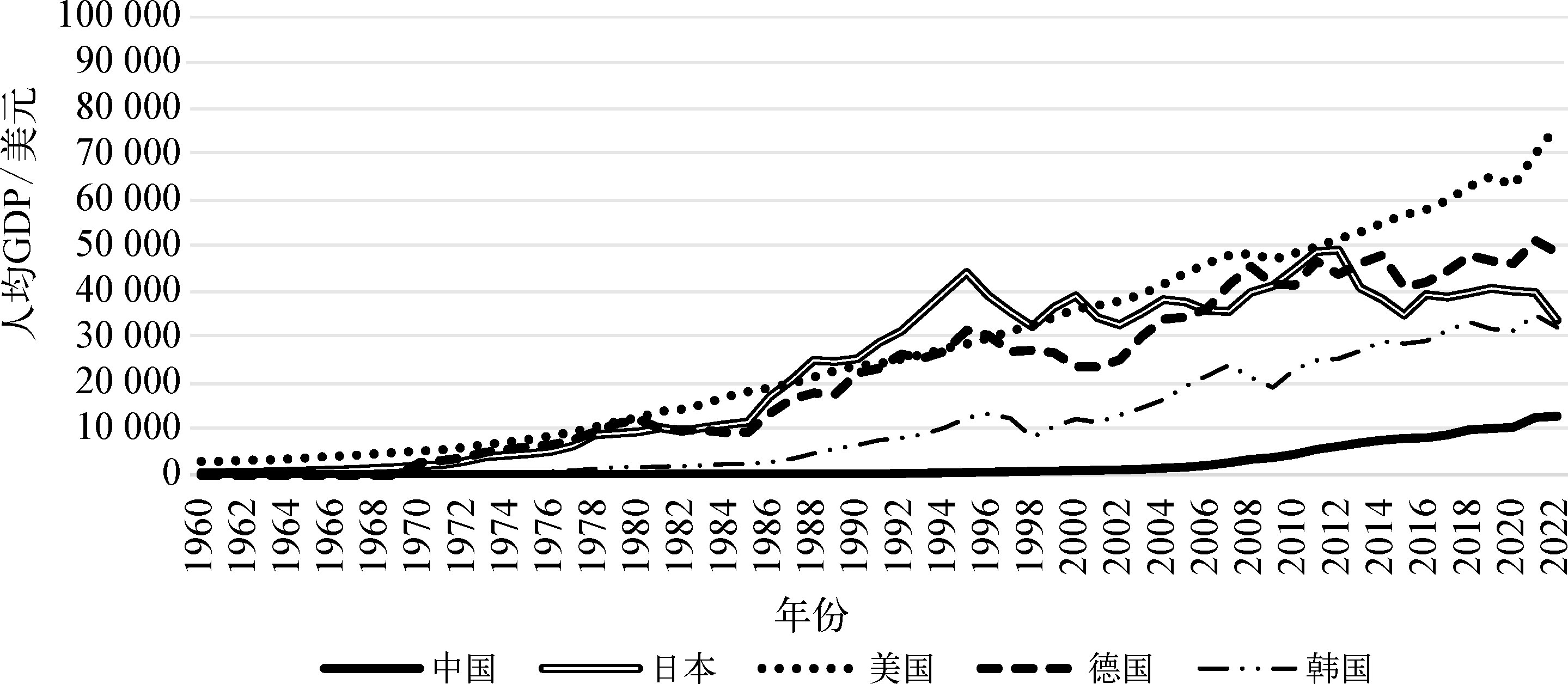 图2-1 1960—2022年中、日、美、德、韩人均GDP变化趋势