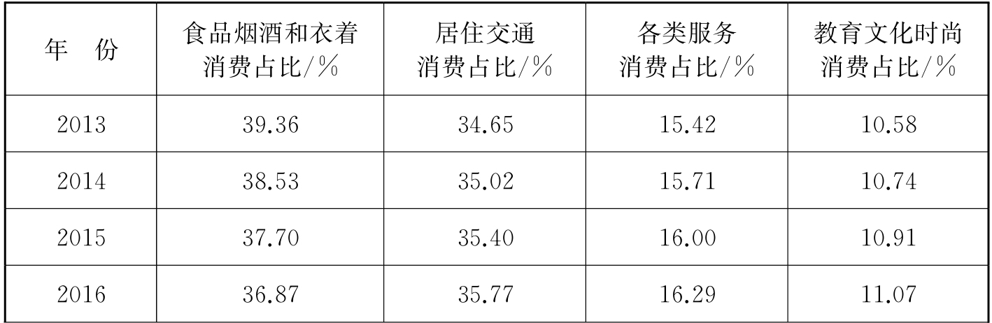 (1)消费模式的第一阶段。当人均GDP在3 000美元以下时,是工业拉动经济增长的阶段 [8] ,人们的消费支出主要为吃穿。