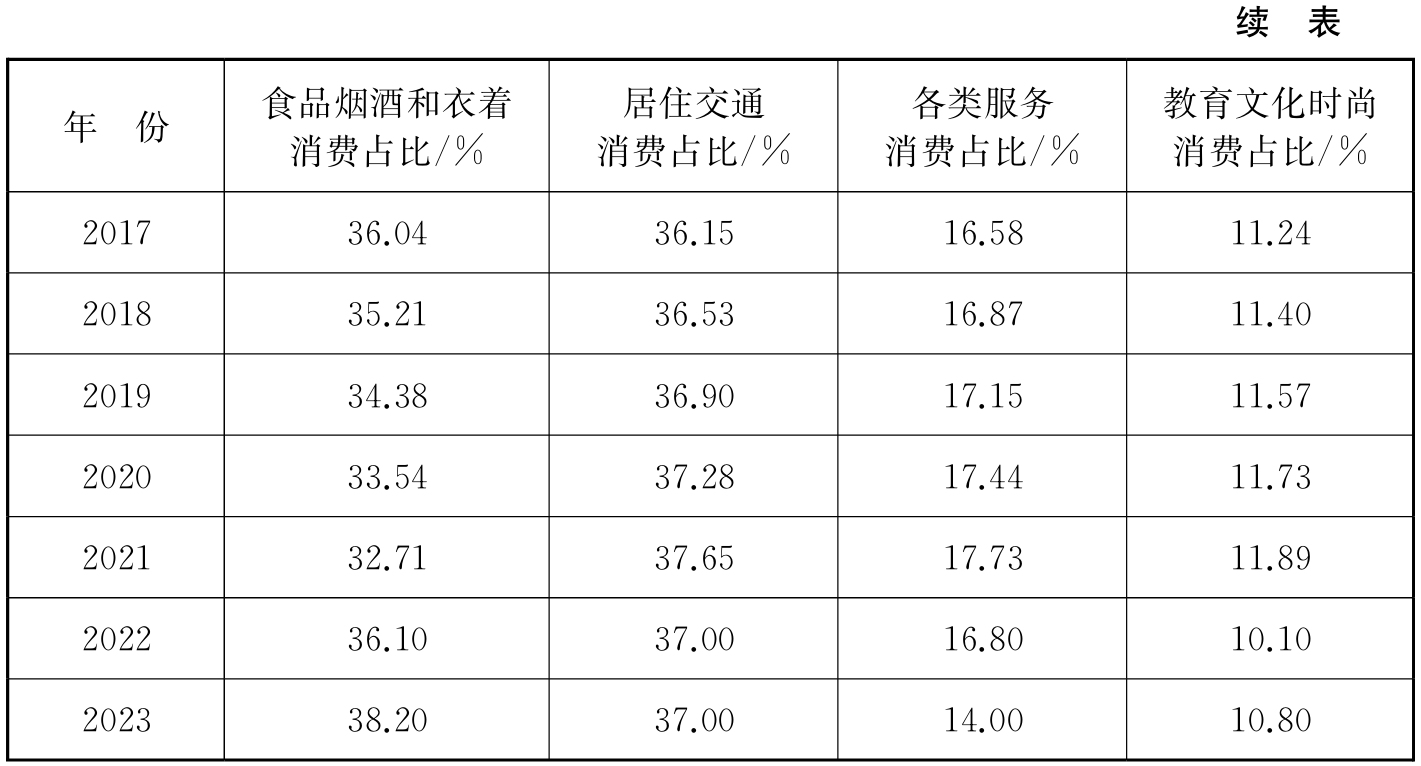 表2-4 2013—2023年我国全体居民人均消费支出中四类消费的占比