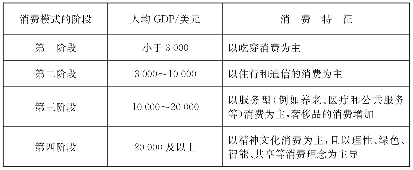 (4)消费模式的第四阶段。人均GDP达到20 000美元,则代表着真正跻身发达国家的行列。当人均GDP超过2万美元之后,消费模式就逐渐演变到第四阶段。此阶段,精神文化型消费已经占主导地位,国民已经逐渐形成个性、理性、文明、绿色、智能、共享等消费理念。