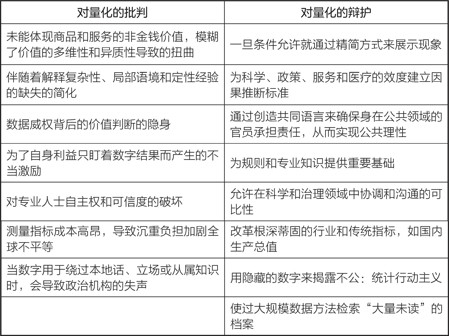 表0.1 对量化的批判和辩护