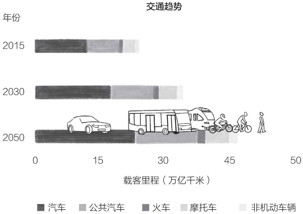 我们会用令人充满希望的数字、统计数据和各种精美插图来描述城市,吸引更多人来促进城市的繁荣。在这样的背景下,个人的得失显得微不足道。一个有效的交通系统是人们实现梦想的第一步。而这样的交通愿景在许多国家都难以实现。从图6.1中我们可以看到未来几年出行的发展趋势,尤其是城市。根据经济合作与发展组织的国际交通论坛(International Transport Forum)的估计,到2050年,经济合作与发展组织国家城市中心的交通总量,以载客里程计算,可能会比现在翻一番 [1] 。
