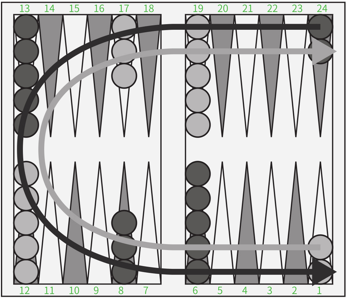 知道这一点会有用,因为可用的开局一招是将两个骰子的点数应用到同一个棋子上——因此,例如,您可以将一个棋子先移动6个位置,然后再移动5个位置,这样总共移动11个位置,如图2-4所示。尽管这种概率对比赛的结果很重要,但是它的重要性会因受阻点数而改变。游戏策略在很大程度上涉及对这些阻挡的处理,原因有二。首先,因为需要按照每个骰子上的数值单独移动,所以如果向前移动5个位置或向前移动6个位置没有受到阻挡,那么一个棋子只能移动11个位置(沿用上面的例子)。其次,当某玩家有一个或多个棋子被吃掉时,他在将该棋子(或多个棋子)放回棋盘之前不能采取任何其他行动。根据掷骰子的结果,棋子回到棋盘上玩家开始时的那