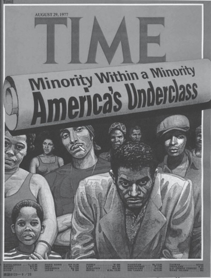 1977年8月29日,美国《时代》周刊的封面人物可谓极具冲击力。在该期封面上,大书特书着“少数派中的少数派——美国的下层阶级”。这行字下面的九个人,有黑人和拉美裔美国人(图2-1)。周刊中以《美国的下层阶级:富裕国家中的极度贫困与绝望》为题的报道,描绘了美国大都市里下层阶级的样貌。