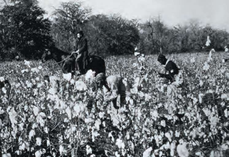 奴隶在美国的一块棉花田里工作,一位骑马的监工在监视他们。如果奴隶们试图逃跑或反抗,他们可能会被诊断为心理障碍中的漂泊症患者。