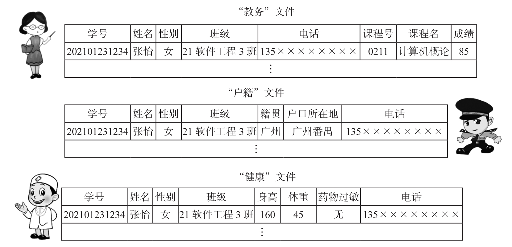 然而,这种数据管理技术也存在不足之处。以校园信息管理系统为例,学校各个部门职能不同,需要对学生的部分相关信息进行存储和管理。教务处主管教务,建立了“教务”文件,以存储与教务相关的信息,如学生的学号、姓名、性别、班级、电话、课程号、课程名、成绩等信息;保卫处负责校园门禁管理和人员的户籍管理,建立了“户籍”文件,以存储学生的学号、姓名、性别、班级、籍贯、户口所在地、电话等信息;校医院则建立了“健康”文件来记录学生的健康状况,如学生的学号、姓名、性别、班级、身高、体重、药物过敏、电话等信息。“教务”文件、“户籍”文件和“健康”文件既存在部分相同的数据,如学生的学号、姓名、性别、班级、电话等,也各自存储着一些特有的数据,如图1.10所示。