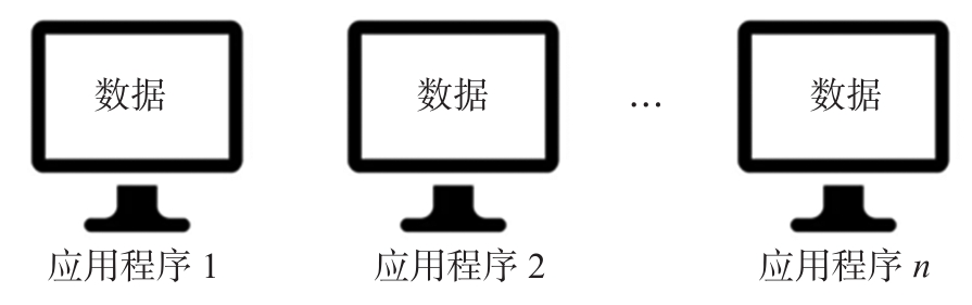 在20世纪50年代中期以前,计算机的软硬件均不完善。在硬件方面,没有外存或只有磁带外存等顺序存储设备,输入输出设备简单;在软件方面,只有汇编语言等非常低级的计算机语言,还没有操作系统和可管理数据的软件系统。计算机主要充当科学计算器的角色。数据的组织是面向应用的,如图1.8所示,各个应用使用独立的程序,且数据是程序的组成部分。修改数据会导致程序也需要修改。由于数据是经常会变化的,因此程序员编写和维护程序的工作任务非常繁重。