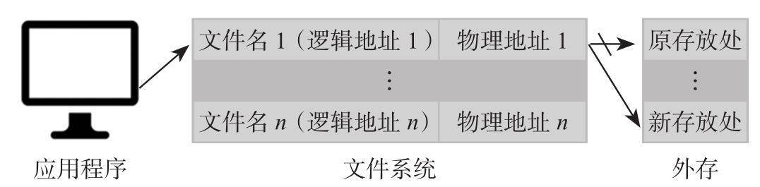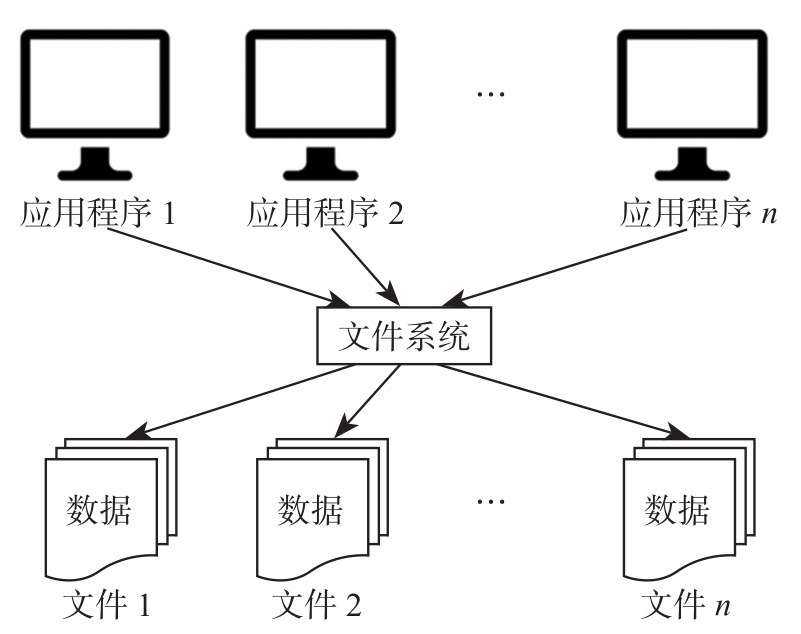 在20世纪50年代后期至20世纪60年代中期,计算机的存储技术得到了很大的发展,大容量存储设备——硬盘等直接存取设备的出现,使得数据可以长期保存在磁盘上。这不仅提高了计算机的输入输出能力,也大大推动了软件技术的发展。操作系统和高级程序语言的出现使数据处理迈上了一个新的台阶。操作系统中的文件系统以文件的形式对数据进行统一的管理。数据被组织成文件存储在外存,且文件格式多样。操作系统为用户使用文件提供了友好的界面。如图1.9所示,文件的逻辑结构与物理结构分离开了,用户只需要通过文件名——由文件系统负责找到该文件名对应的物理地址——就可以实现对数据的存储、检索、插入、删除和修改。数据可以以文件为单位被多个应用程序共享,数据和应用程序之间有了一定的独立性。有了文件系统,计算机的数据管理就得到了极大的改善,这使得计算机的应用领域从科学计算扩展到企业信息管理。