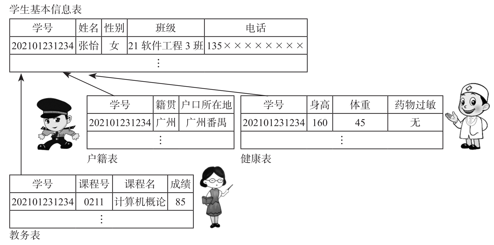 数据库技术研究如何组织和存储数据,如何高效地获取数据并处理数据。数据库技术的根本目标是降低数据冗余,实现数据共享。在管理数据时,从整体关联用户出发而不再只针对某种特定的应用来考虑数据的组织和存储。以前述校园信息管理系统为例,可统一分析教务处、保卫处、校医院等部门的数据管理需求,从数据共享的角度出发,将各部门关心的学生基本信息抽取出来构建一个独立的数据表,各部门共享学生基本信息表里面的数据。此外,还可根据各个部门职能相关的业务单独构建数据表,而且这些职能相关的业务数据表只对相关的业务人员开放访问权限,如图1.12所示。例如,校医院的医生具有访问健康表的权限,而无权查看户籍表与教务表的数据;当校医院的医生需要联系某学生时,可以通过学号在学生基本信息表里找到该学生的电话号码。