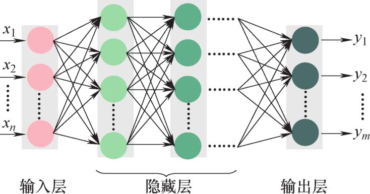 受限于计算机算力和数学理论的不够完善,最初的神经网络隐藏层的层数比较有限,大多只有3~5个隐藏层,称为浅层神经网络。随着计算机计算能力的提升和数学理论的完善,神经网络隐藏层的层数越来越深,有十几层到上百层,如图2.6所示,就发展成了深层神经网络,也称为深度学习。深度学习的“深度”两字有两个含义:一个是网络层数深;另外一个是能够学习到样本更深层次的特征。要搭建一个深度学习模型来求解问题,首先需要选择神经网络类型,比如全连接神经网络、卷积神经网络等,全连接神经网络的结构比较固定,卷积神经网络更灵活;然后需要确定神经元激活函数、选择参数学习方法等。本章我们以全连接神经网络设计来学习深度学习的一些基本理论,卷积神经网络将在下一章进行介绍。