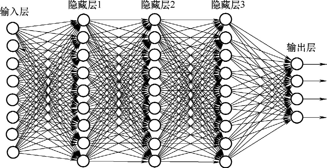 本次分类任务使用深度神经网络(DNN)。DNN是深度学习的基础网络,其网络结构包括输入层、隐藏层(可有多层)、输出层,层与层之间全部采用全连接的方式,如图2.21所示。