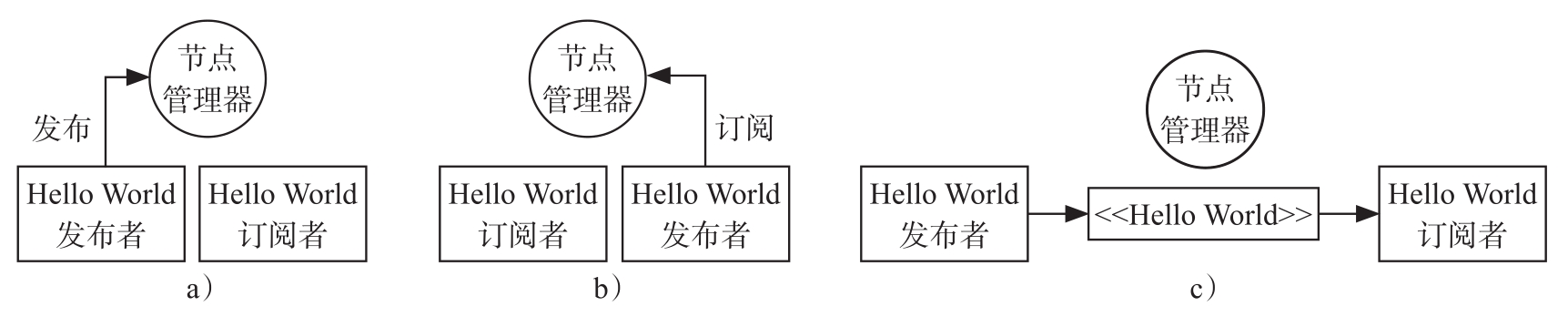 图1.8显示了ROS节点管理器如何与发布节点和订阅节点交互,发布者节点发布带有Hello World消息的字符串类型主题,订阅者节点订阅此主题。
