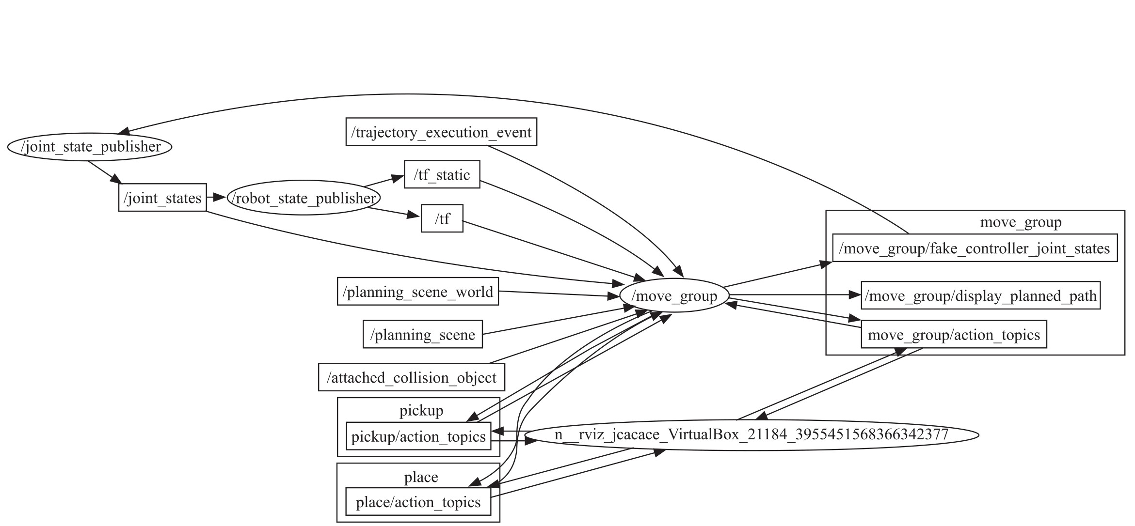 如你所见,主题用矩形表示,而节点用椭圆表示。此图中不包括消息和参数。这些类型的图可以使用名为rqt_graph的工具生成(http://wiki.ros.org/rqt_graph)。