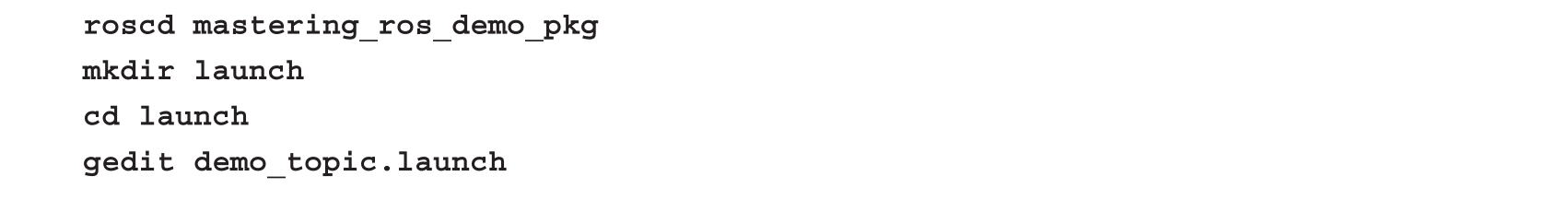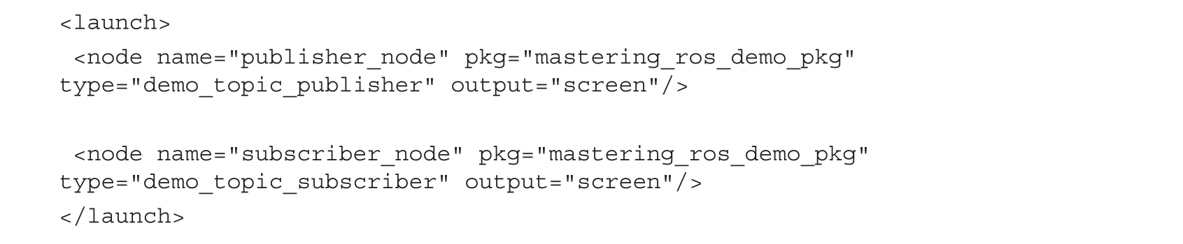 ROS中的启动(launch)文件在启动多个节点时非常有用。在前面的示例中,我们看到最多有两个ROS节点,但想象一下,如果我们需要为一个机器人启动10个或20个节点的情形。如果我们在终端中逐个启动每个节点将是很麻烦的事。相反,我们可以在一个launch文件中基于XML格式编写所有的节点,可以使用roslaunch命令解析此文件,然后启动其中的所有节点。