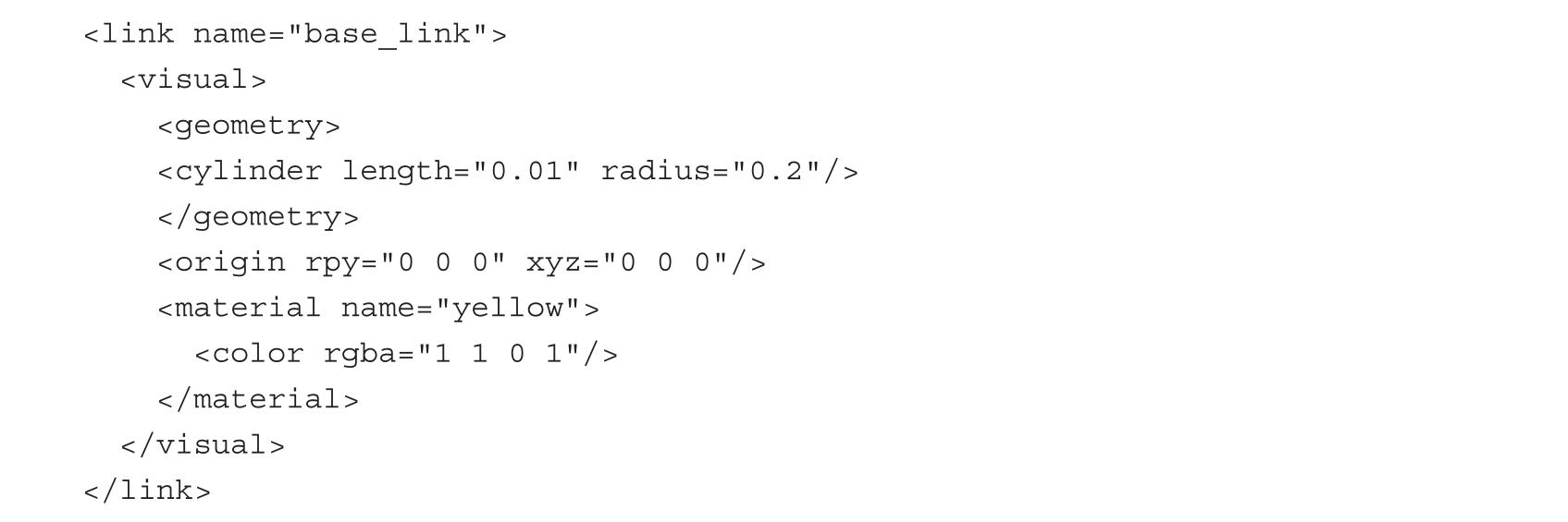 前面的这段代码是pan-and-tilt机械结构的base_link的定义。<visual>标签描述了连杆的可见外观,它将在机器人仿真中显示出来。我们可以用这个标签来定义连杆的几何形状(圆柱、立方体、球体或网格模型)以及连杆的材质(颜色和纹理):